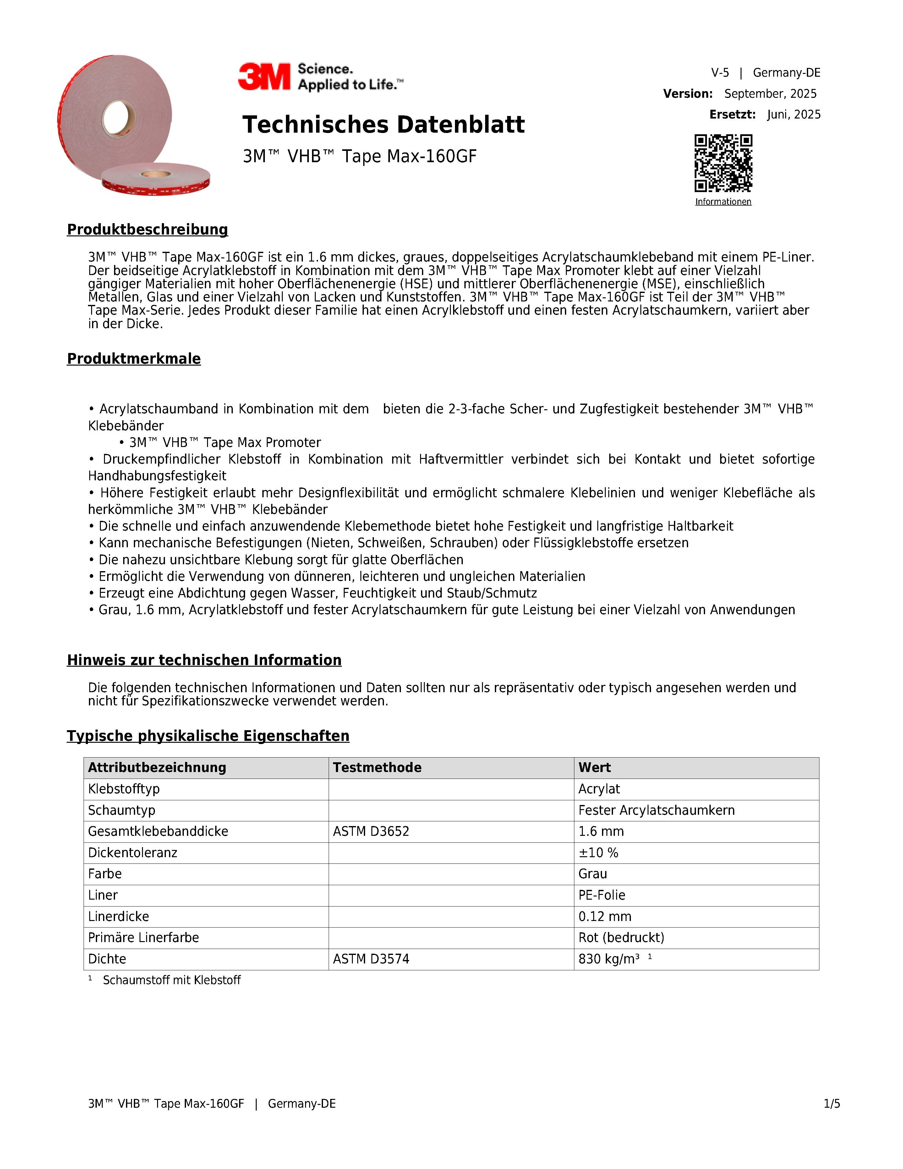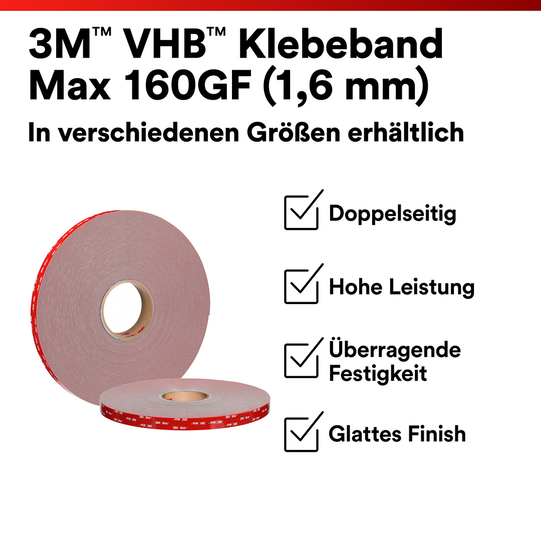 - Überragende Klebekraft: Überlappscherfestigkeit bis zu 3,24 MPa (470 psi) – höher als herkömmliche 3M™ VHB™ Klebebänder.