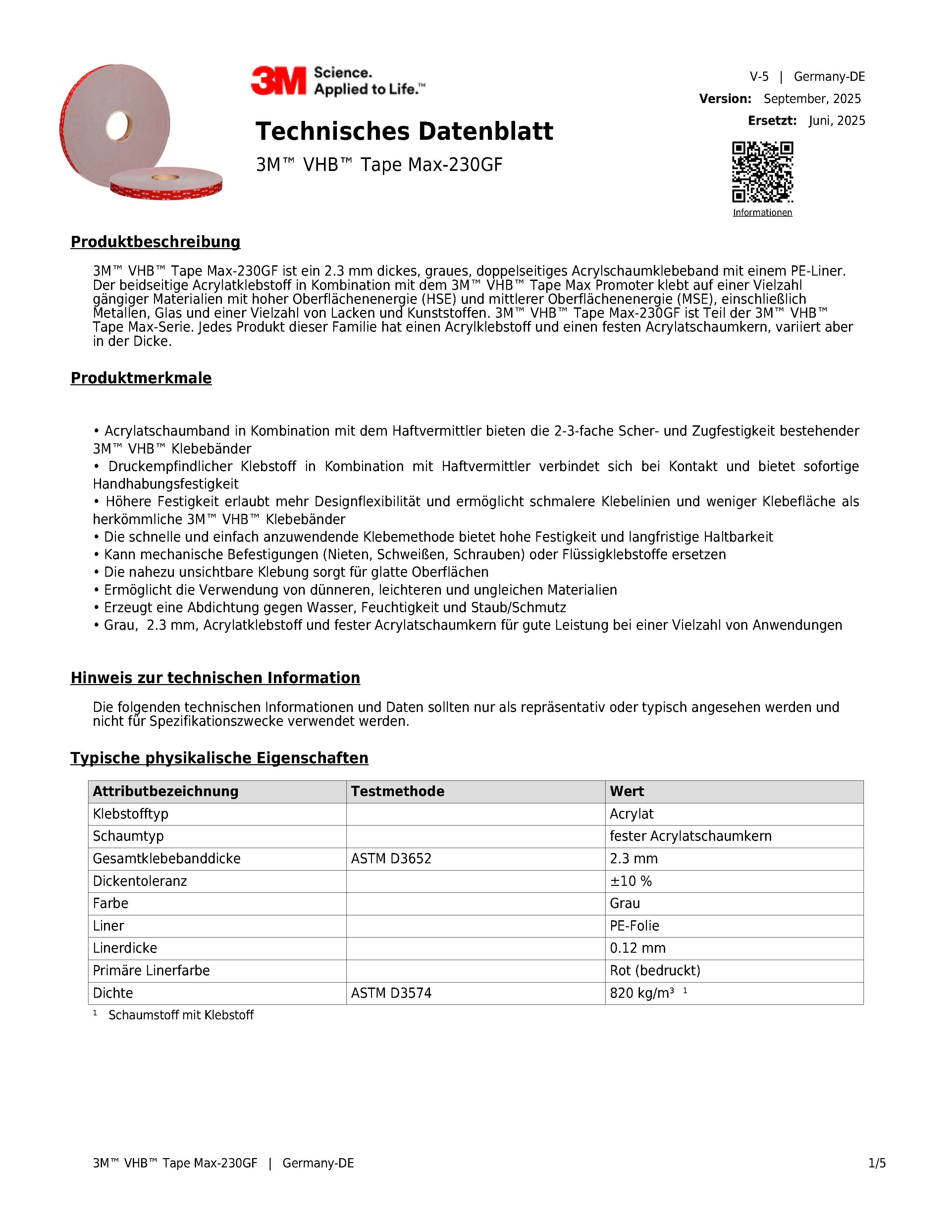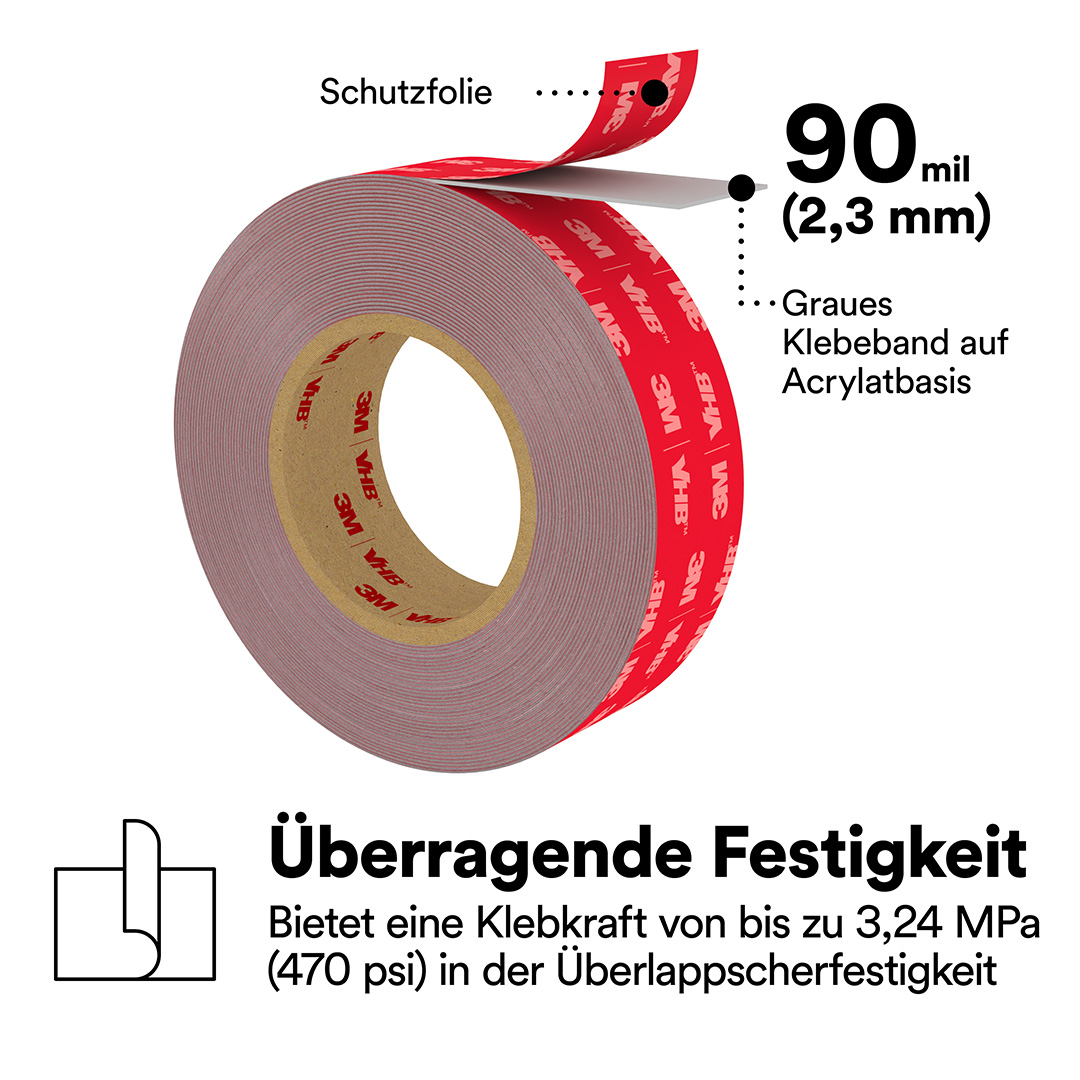 - Überragende Klebekraft: Überlappscherfestigkeit bis zu 3,24 MPa (470 psi) – höher als herkömmliche 3M™ VHB™ Klebebänder.